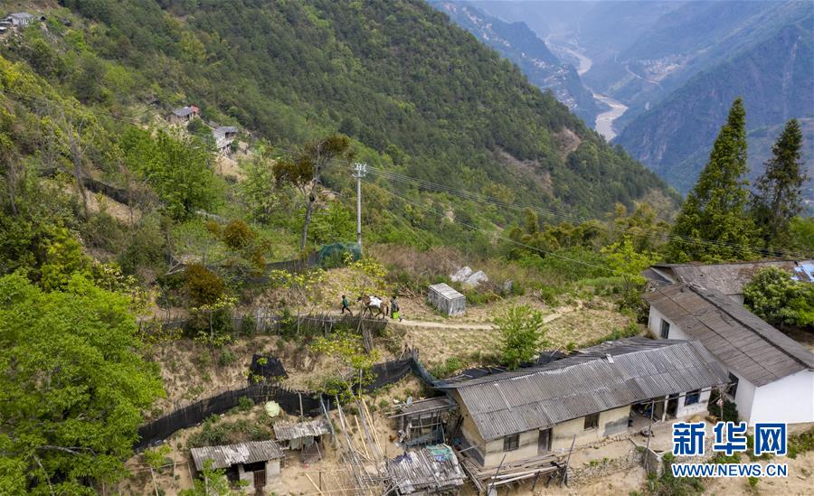 村民李小波带着孩子回到山上看望母亲(无人机照片 4月16日摄 )。新华社记者江文耀摄