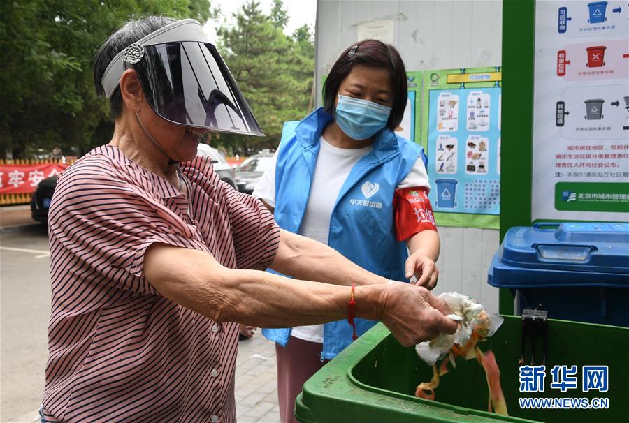6月11日, 在海淀区中关村街道东南社区,工作人员(右)指导居民投放厨余垃圾。 近日,北京市海淀区中关村街道设计的智能垃圾分类驿站在东南社区投入使用。据了解,该驿站集厨余垃圾桶智能开合、语音播报分类提示、诱捕蚊蝇夜间照明、人脸识别录像等功能于一体。居民在投放厨余垃圾时,触发垃圾桶底部的红外感应装置,桶盖自动打开,投放完毕后桶盖自动缓降复位,实现厨余垃圾无接触式投放。 新华社记者 任超 摄