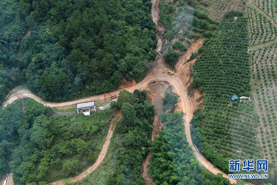 工程机械在抢修通往阳朔县普益乡大山村的道路(6月10日摄)。 近日,广西阳朔县普降暴雨。山体塌方、滑坡导致该县普益乡大山村通村公路无法通行,供电和通讯也中断,约900人受困。灾情发生后,当地有关部门及时组织抢险救灾。截至6月10日22时,通往大山村的道路已经抢通。 新华社记者 陆波岸 摄