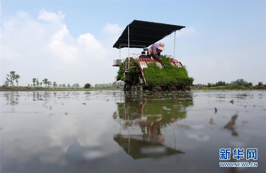 6月11日,在江苏省扬州市邗江区槐泗镇,农民在田间进行机械插秧作业。 近年来,江苏省扬州市邗江区槐泗镇大力推广水稻机械化插秧技术,降低水稻种植成本,减轻农民劳动强度,提高作业效率。 新华社发(孟德龙 摄)