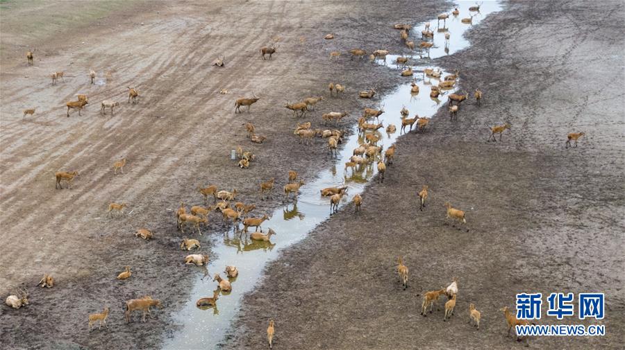 6月10日在江苏大丰麋鹿国家级自然保护区拍摄的一群麋鹿(无人机照片)。新华社记者 韩瑜庆 摄