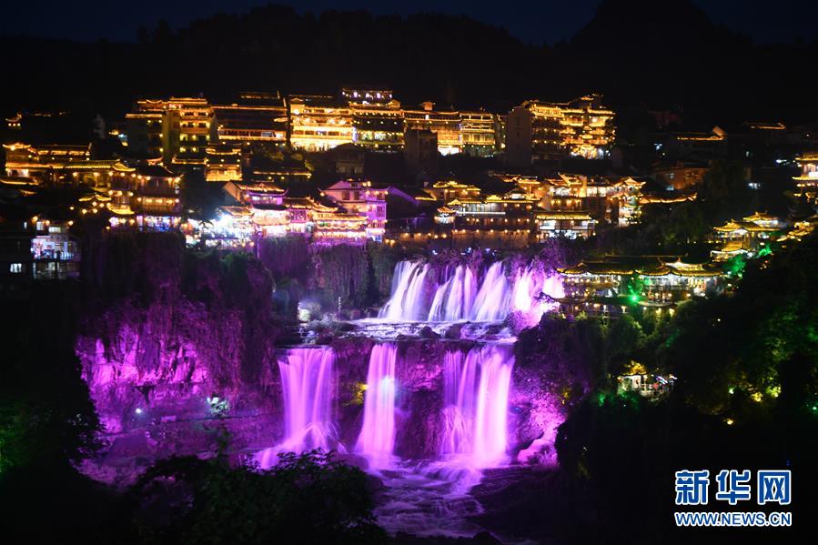 这是6月11日拍摄的湘西土家族苗族自治州永顺县芙蓉镇景区。 近日,湘西土家族苗族自治州永顺县芙蓉镇景区在做好疫情防控的情况下恢复开放。夜幕降临,景区内的瀑布、吊脚楼与灯光交相辉映,美不胜收,吸引许多游客前来休闲、参观。 新华社记者 薛宇舸 摄