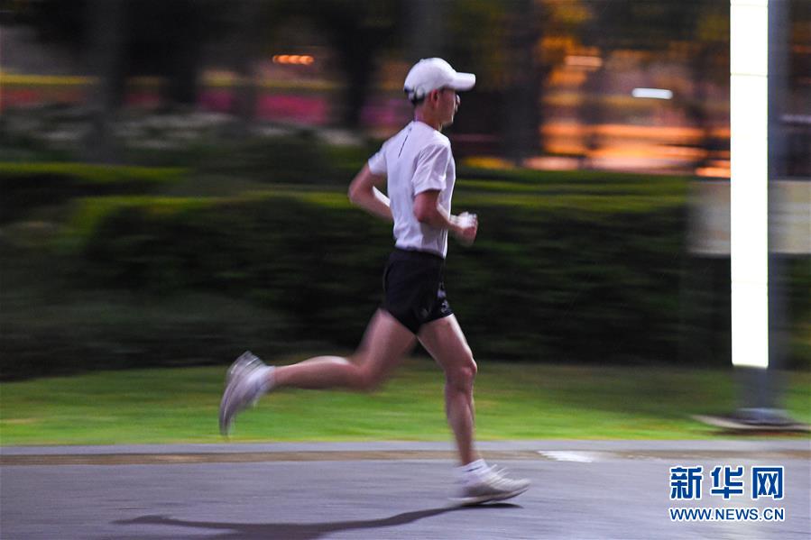 一位市民在海口万绿园夜跑(5月28日拍摄)。 近年来,夜跑成为越来越多都市人热衷的健身方式之一。在海南海口,每当夜幕降临,“夜跑族”来到海口万绿园、世纪公园等夜跑场所跑步,用一身酣畅淋漓的汗水摆脱白天工作中的压力,享受跑步带来的欢愉。 新华社记者 蒲晓旭 摄