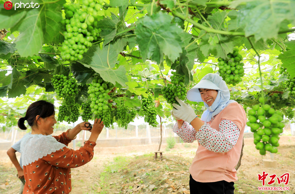 2020年6月11日,安徽省淮北市濉溪县刘桥镇任圩村扶贫产业园葡萄大棚里,村民正在给葡萄疏果。岳建文/IC photo