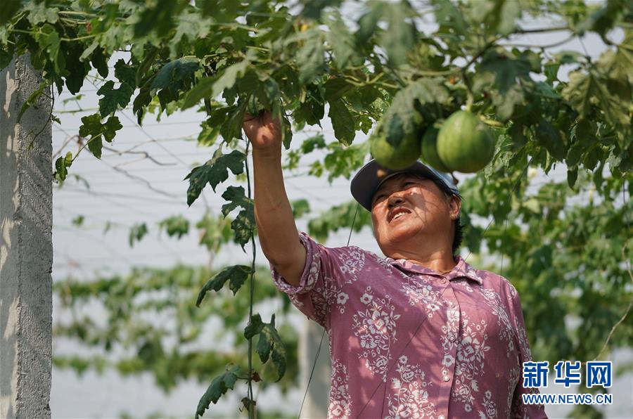 在宿迁市宿城区中扬镇蒋刘村瓜蒌种植基地,种植大户王雪梅在进行田间管护(6月11日摄)。新华社记者 季春鹏 摄
