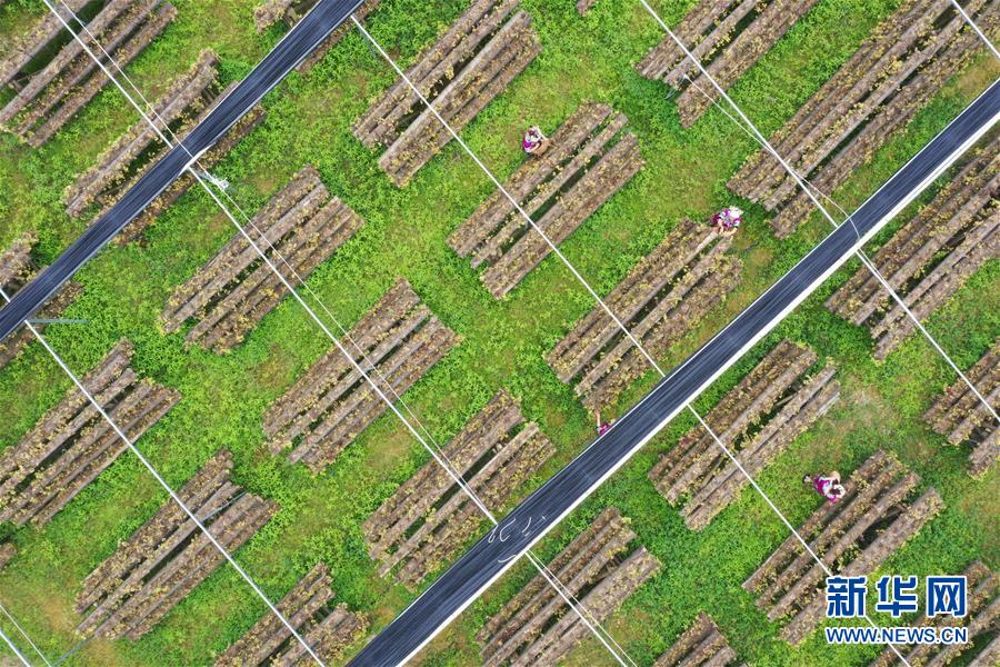 这是6月12日无人机拍摄的贵州省黔东南苗族侗族自治州锦屏县敦寨镇龙池村石斛种植基地。 2019年以来,贵州省黔东南苗族侗族自治州锦屏县积极探索乡村振兴、助民增收之路,利用本地森林覆盖率高和日照长的优势,大力发展树下套种中药材、树上种植铁皮石斛、树中养蜂的“林中生态经济”。目前,全县已种植铁皮石斛11000多亩、中药材91000亩,养殖蜜蜂7000箱,村民通过就近就业增收,“守着青山过穷日子”的现状逐步改善。 新华社记者 杨楹 摄