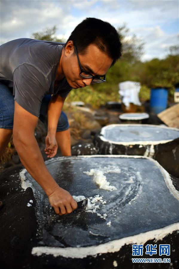 6月10日,海南省洋浦经济开发区盐田村村民谭晋开在盐田中收盐。 新华社记者 郭程 摄