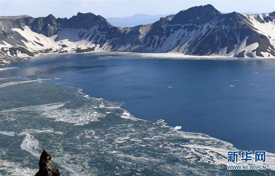 这是6月12日拍摄的长白山天池。 近日,长白山天池冰层逐渐消融,迎来“开冰季”。 新华社记者林宏摄