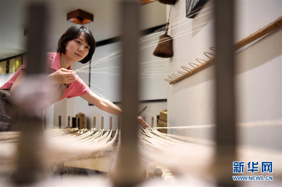 月12日,在重庆荣昌的天运夏布会馆,非遗传承人马琳沁在展示传统夏布生产工艺——牵线。新华社记者 唐奕 摄