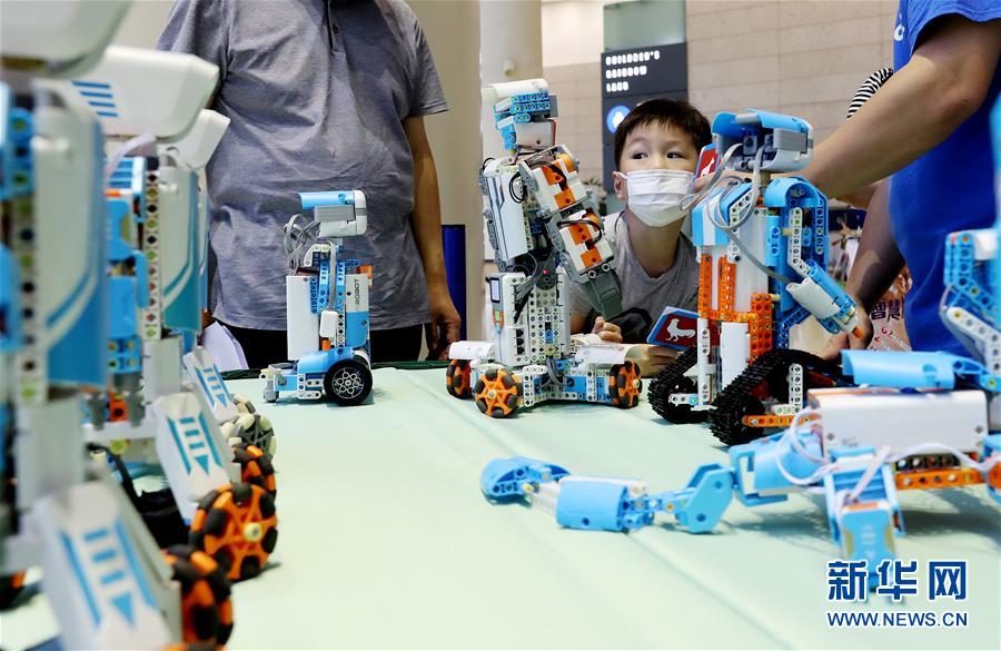6月12日,一位小朋友在观看一组智能机器人展品。 新华社记者 方喆 摄