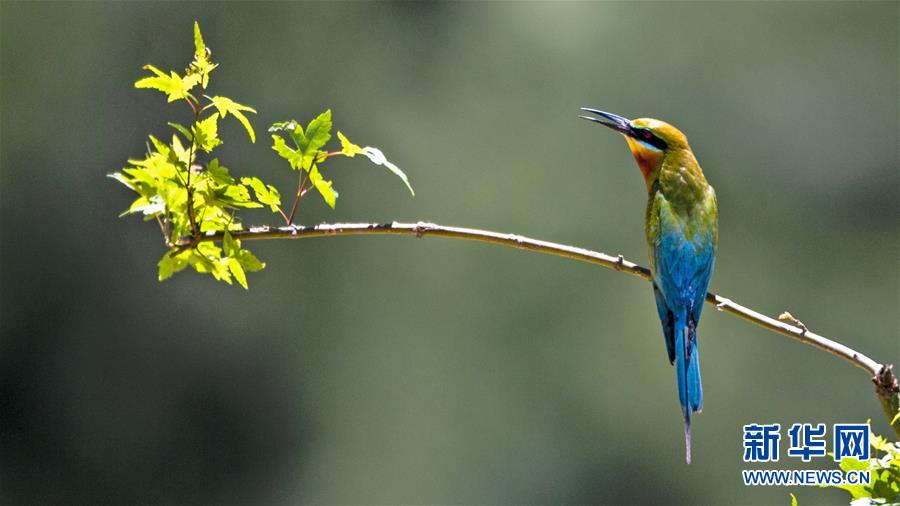 栗喉蜂虎在福建省晋江市深沪镇科任村一山坡上觅食嬉戏(6月12日摄)。 入夏以来,逾百只栗喉蜂虎飞临闽南晋江市深沪镇科任村筑巢栖息。 新华社记者记者 梅永存 摄