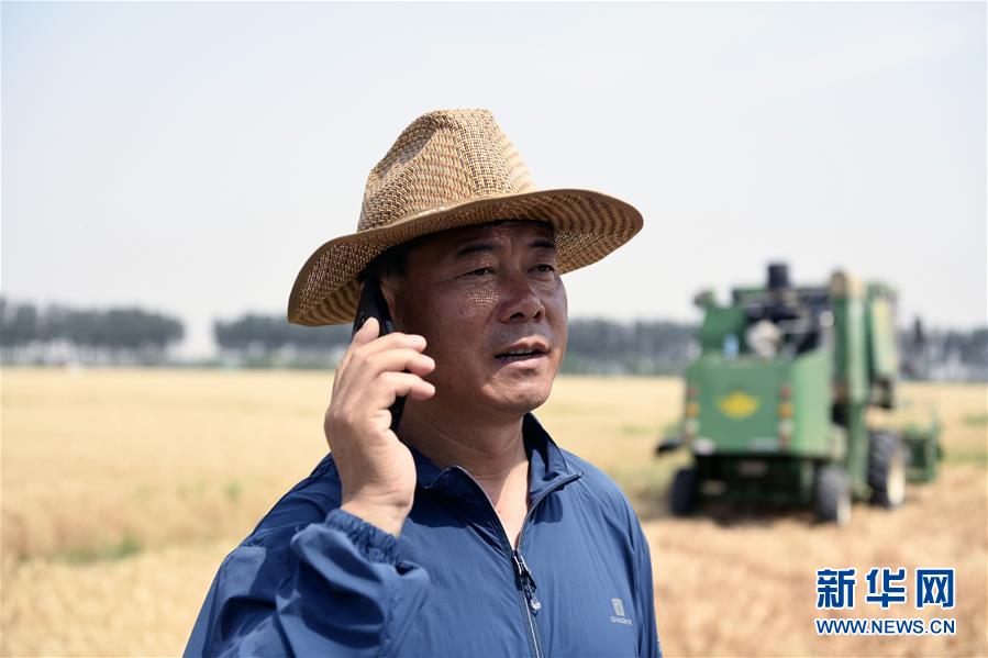 6月13日,魏德东在小麦收割现场联系收割机。新华社记者 范长国 摄
