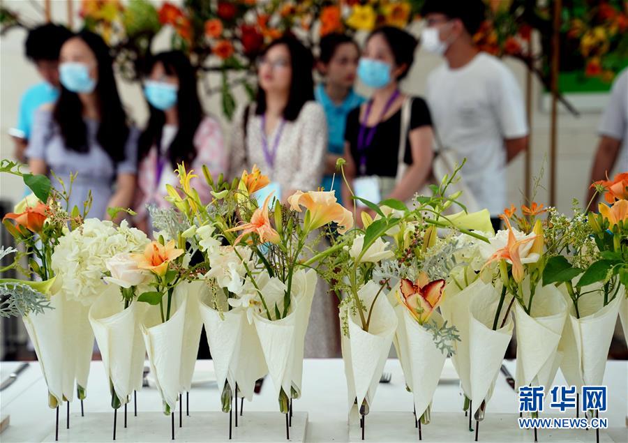 这是开幕式现场展示的大学生设计创作的萱草花小花束(6月13日摄)。 6月13日,“2020中国(上海)萱草文化节”在上海应用技术大学开幕,校园里数百个品种的萱草花竞相绽放,萱草科研推广、萱草文化交流等多项活动同时举行。 新华社记者刘颖摄