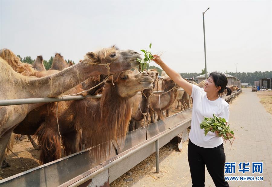 6月13日,河北省唐山市丰南区漠尚客骆驼养殖专业合作社的工作人员在喂养骆驼。新华社记者 牟宇 摄