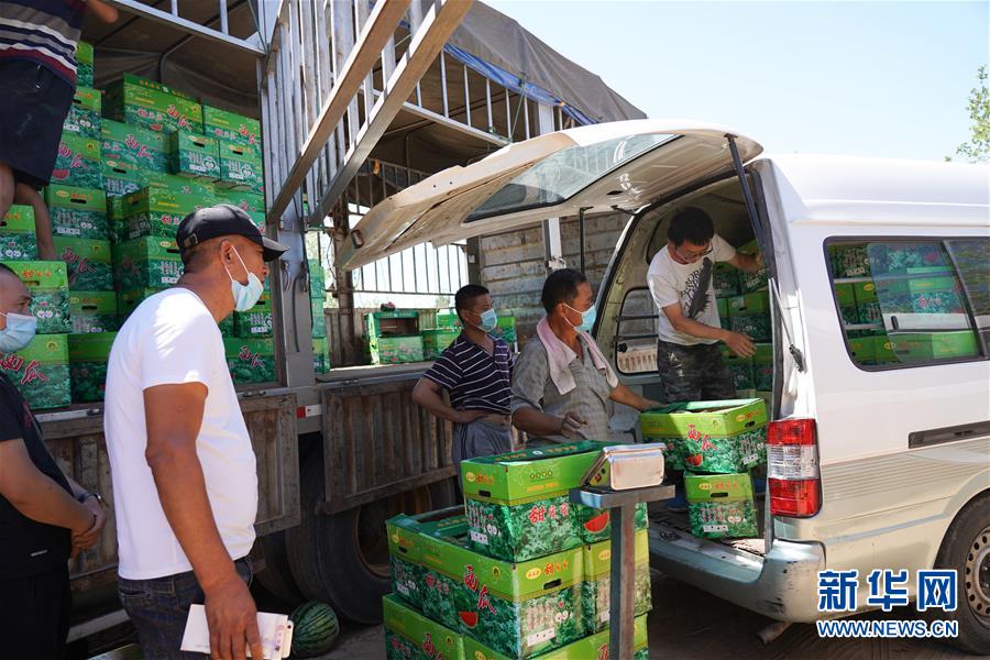 6月14日,在盛芳国际花卉总部基地指定临时交易场地,商户在搬运车上的西瓜。新华社记者鞠焕宗摄