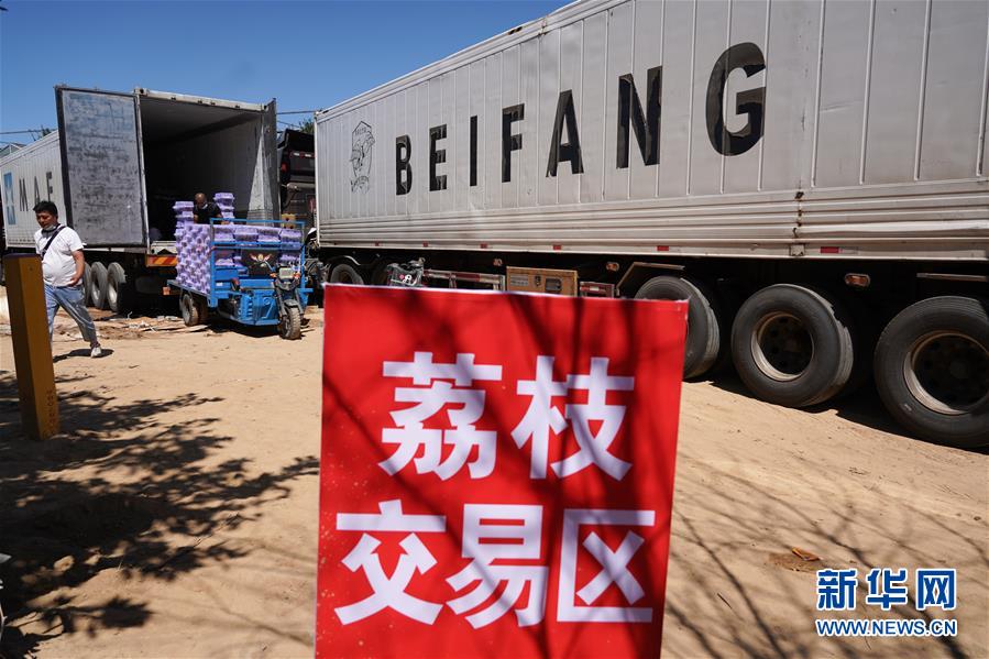 6月14日,在盛芳国际花卉总部基地指定临时交易场地,商户在搬运车上的荔枝。新华社记者鞠焕宗摄