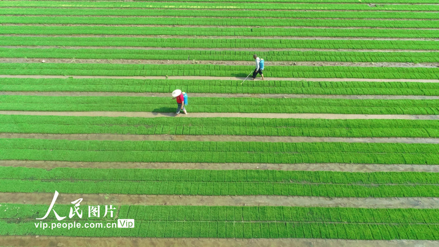 2020年6月14日,江苏省连云港市灌云县伊山镇一家合作社的农民在水稻秧苗田里进行田间管理。 近年来,连云港市灌云县通过“合作社+农户”形式进行规模化育秧,为水稻种植户提供耕种、管护、收割、收购等一条龙服务,提高规模化效益,帮助农民增收。(吴正祥/人民图片)