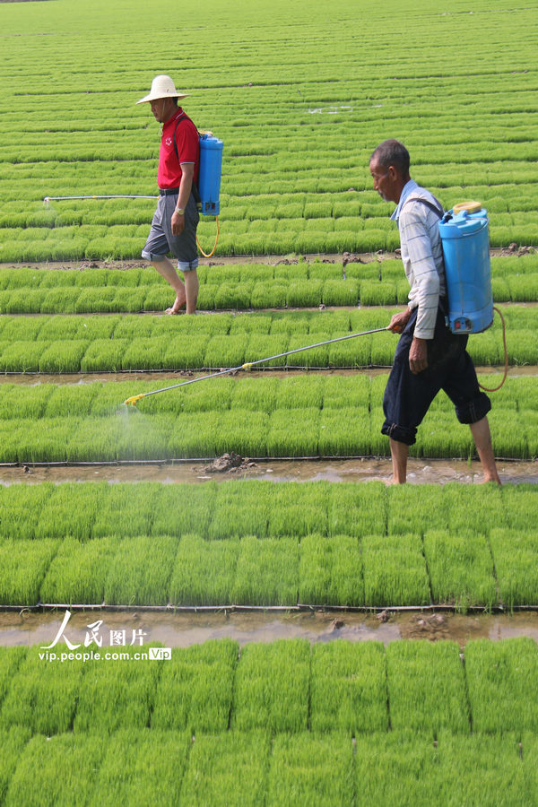2020年6月14日,江苏省连云港市灌云县伊山镇一家合作社的农民在水稻秧苗田里进行田间管理。 近年来,连云港市灌云县通过“合作社+农户”形式进行规模化育秧,为水稻种植户提供耕种、管护、收割、收购等一条龙服务,提高规模化效益,帮助农民增收。(吴正祥/人民图片)