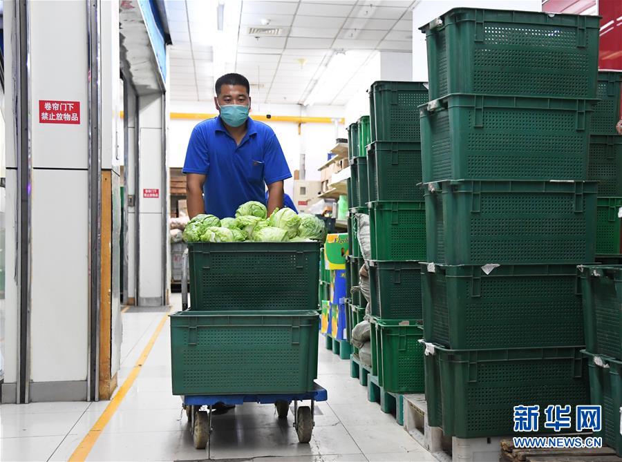 6月15日,在北京市朝阳区的京客隆甜水园店,工作人员在搬运蔬菜。 近日,位于北京市朝阳区的京客隆甜水园店在做好新冠肺炎疫情防控工作的前提下,加大农产品备货量,保障市场供应。 据了解,京客隆甜水园店的所有蔬菜、水果均来自京客隆集团自有配送中心的果蔬直采基地,其中蔬菜主要来自河北、山东等多个直供产地。目前京客隆甜水园店每日蔬菜供应量约为平日的8倍左右,鲜肉供应量约为平日的4倍左右。 新华社记者 任超 摄