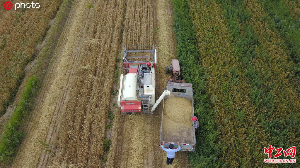 2020年6月14日,新疆巴音郭楞蒙古自治州(简称巴州)轮台县阿克萨来乡阿克萨来村二组农民在收割冬小麦。眼下,新疆巴音郭楞蒙古自治州21.44万亩冬小麦全面进入收获阶段,各乡镇开启夏收农忙模式,突击做好小麦抢收工作,确保丰产又丰收。据了解,新疆巴音郭楞蒙古自治州具有得天独厚的水土光热资源,土壤肥沃,生态环境良好,是新疆重要的粮食产区之一。今年,春冬小麦种植面积达45万亩左右,其中冬小麦种植面积达21.44万亩。确·胡热/IC photo
