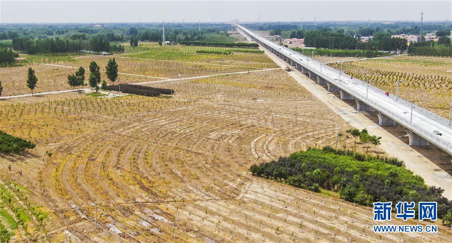 这是6月15日拍摄的京雄城际铁路河北霸州段生态绿化带(无人机照片)。新华社记者 李晓果摄
