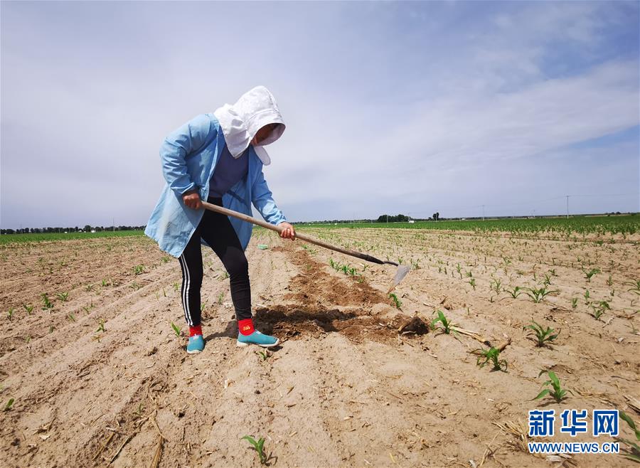 6月13日,在内蒙古乌审旗,农民张爱琴在补种玉米。 新华社记者 贾立君 摄