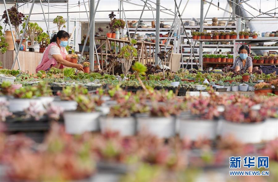 6月15日,农民在清河县葛仙庄镇菜园村陌仙多肉植物培育基地打理多肉植物。新华社记者 牟宇 摄
