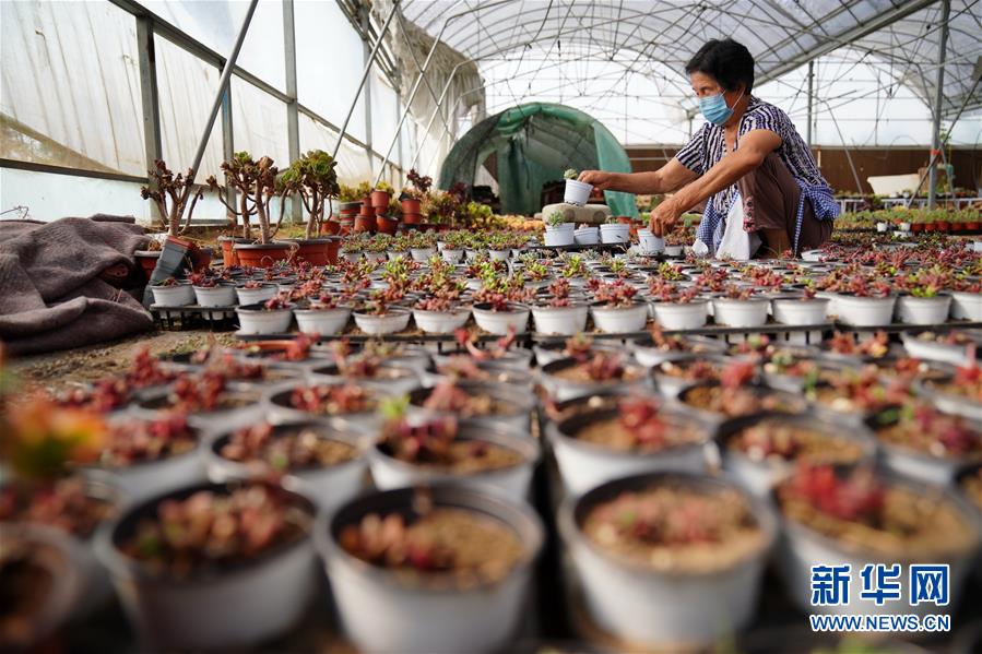 6月15日,农民在清河县葛仙庄镇菜园村陌仙多肉植物培育基地打理多肉植物。新华社记者 牟宇 摄