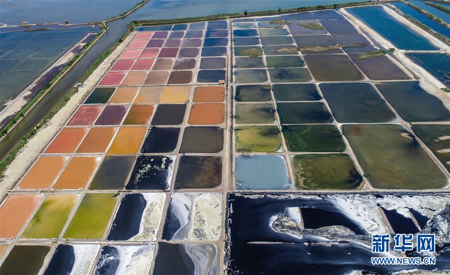 6月15日在山东省荣成市港西镇拍摄的一处盐田(无人机照片)。 盐田的水在高温下不断蒸发,浓度变大,呈现出色彩斑斓的独特景象,宛如一张巨大的调色板。 新华社发(李信君 摄)
