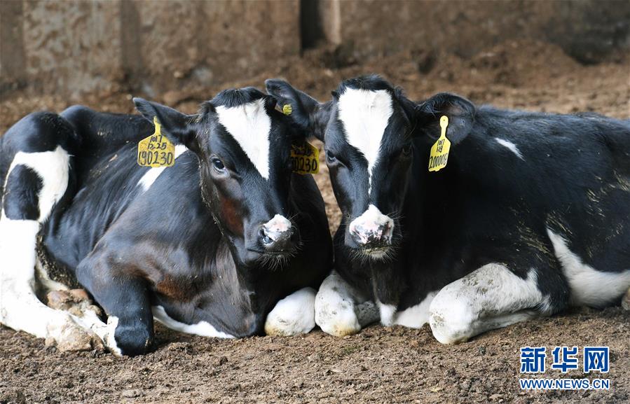 6月16日,寻甸稼竜畜牧养殖有限公司奶牛养殖基地的两头牛在圈舍休息。 近年来,云南省昆明市寻甸县羊街镇清水沟村与寻甸稼竜畜牧养殖有限公司,以“党支部+公司+建档立卡贫困户”的精准扶贫模式,以入股参与养殖奶牛的方式带动当地150户农民脱贫增收。 新华社记者 杨宗友 摄