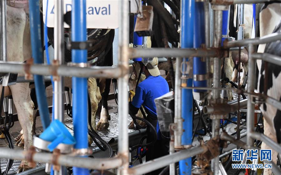 6月16日,工人在寻甸稼竜畜牧养殖有限公司奶牛养殖基地挤奶。 近年来,云南省昆明市寻甸县羊街镇清水沟村与寻甸稼竜畜牧养殖有限公司,以“党支部+公司+建档立卡贫困户”的精准扶贫模式,以入股参与养殖奶牛的方式带动当地150户农民脱贫增收。 新华社记者 杨宗友 摄