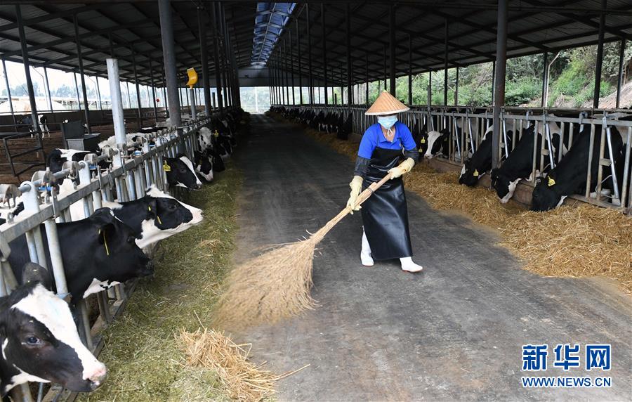 6月16日,工人在寻甸稼竜畜牧养殖有限公司奶牛养殖基地清洁卫生。 近年来,云南省昆明市寻甸县羊街镇清水沟村与寻甸稼竜畜牧养殖有限公司,以“党支部+公司+建档立卡贫困户”的精准扶贫模式,以入股参与养殖奶牛的方式带动当地150户农民脱贫增收。 新华社记者 杨宗友 摄