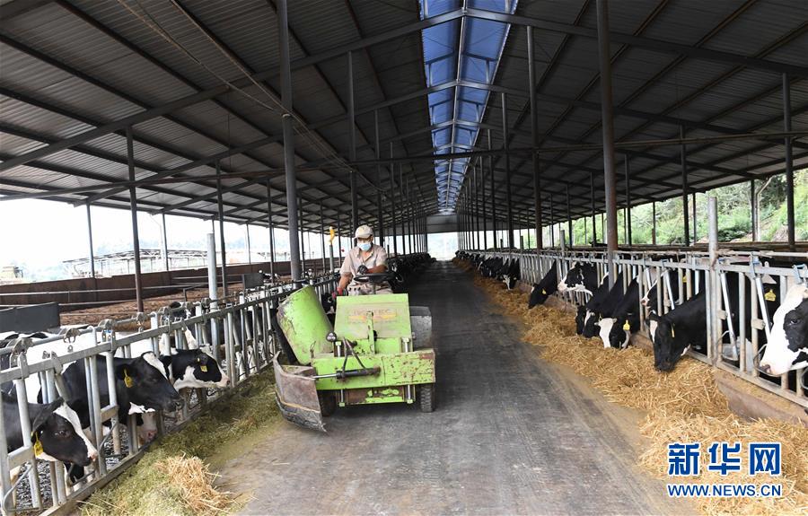 6月16日,工人在寻甸稼竜畜牧养殖有限公司奶牛养殖基地添加饲料。 近年来,云南省昆明市寻甸县羊街镇清水沟村与寻甸稼竜畜牧养殖有限公司,以“党支部+公司+建档立卡贫困户”的精准扶贫模式,以入股参与养殖奶牛的方式带动当地150户农民脱贫增收。 新华社记者 杨宗友 摄