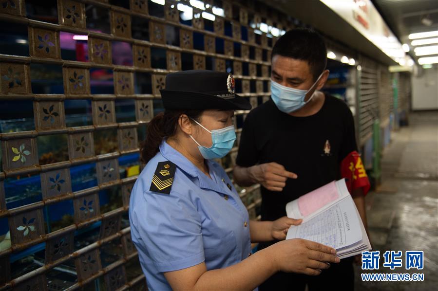 6月16日,丰台区市场监督管理局工作人员在岳各庄批发市场检查食品及相关产品进货台账。 当日,记者走访位于北京市丰台区的农贸市场、餐饮企业、居民小区等场所,有关部门、社会团体等正有序开展消杀、检疫工作。 新华社发(陈钟昊 摄)