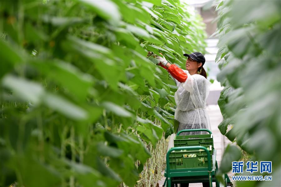 6月16日,工人在河北省南和县一家现代农业产业园采摘黄瓜。 连日来,河北省邢台市南和县在做好疫情防控工作的同时,积极协调设施蔬菜产业集群加大对北京蔬菜市场的供应,通过产地直采直供的方式,全力保障首都“菜篮子”。 新华社记者 朱旭东 摄