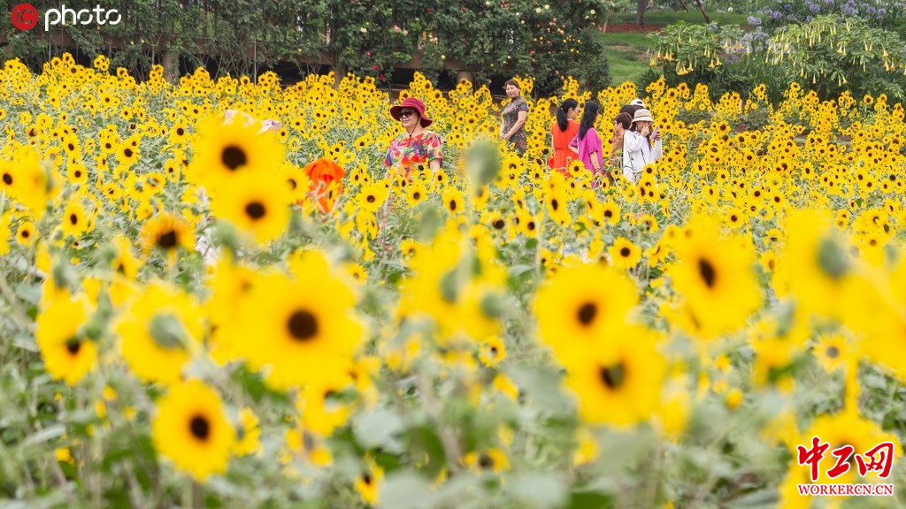 2020年6月16日,成都。仲夏时节,总有许多的梦去希望实现,看花,感受大自然的风采,这便是很多人的一个凤愿。站在这样的季节里,成都漫花庄园4000平方米的向日葵盛开了,大片金黄色的花海,总让人有一种灵动和兴奋的感觉。那一朵朵盛开的葵花,叶如蒲扇,花若金盘,高矮相间,茁壮挺拔,似乎在不停地追寻着阳光。向日葵的寓意是沉默的爱,代表着勇敢地去追求自己想要的幸福,她绽放的不仅是爱情,还有对梦想、对生活的热爱。在美好的日子里,漫步在开满向日葵的花田里,回归那份原本的天真,让自然成为我们最好的老师。 王伟/IC photo