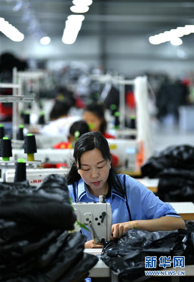 6月16日,在湖北省宣恩县高罗镇一间扶贫工厂的车间里,就业农民在制衣生产线上工作。新华社发(宋文 摄)