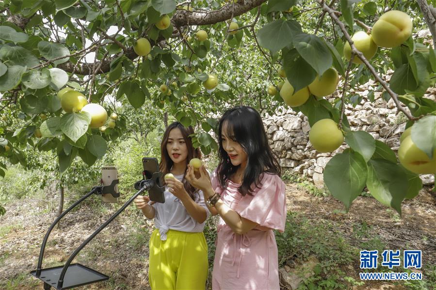 6月16日,网络主播在河北省遵化市娘娘庄乡相古庄村的杏树果园直播推销香白杏。新华社发(刘满仓 摄)