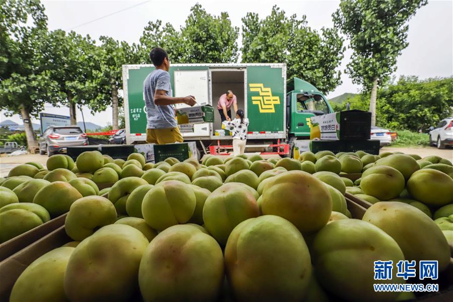 6月16日,在河北省遵化市娘娘庄乡相古庄村,果农将要发货的香白杏装上邮政快递车。新华社发(刘满仓 摄)