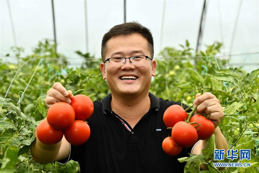 6月17日,在潍坊市寒亭区鲁夏幸福码头农场,夏俊磊展示农场里种植的有机西红柿。 1988年出生的夏俊磊原本从事信息化工程行业,2016年回到家乡山东省潍坊市寒亭区固堤街道,流转1000亩地,创办幸福码头农场,种植葡萄、有机蔬菜,养殖鸡鸭。幸福码头农场采用线上“互联网+农业”进行销售,线下在潍坊市区设立直营店,并推行会员制,不断拓展销售渠道。 夏俊磊的幸福码头农场不断壮大,通过成立农业种植专业合作社,农场面积如今已达8000余亩,吸纳周边村民1200余人,实现着增收致富梦。 新华社记者 郭绪雷 摄