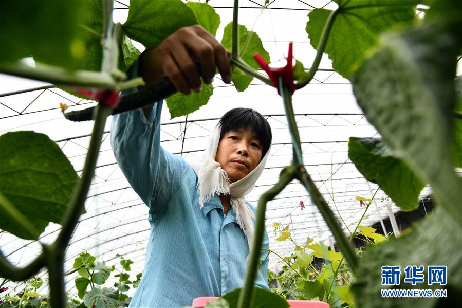 6月17日,在潍坊市寒亭区鲁夏幸福码头农场,村民在采摘黄瓜。 1988年出生的夏俊磊原本从事信息化工程行业,2016年回到家乡山东省潍坊市寒亭区固堤街道,流转1000亩地,创办幸福码头农场,种植葡萄、有机蔬菜,养殖鸡鸭。幸福码头农场采用线上“互联网+农业”进行销售,线下在潍坊市区设立直营店,并推行会员制,不断拓展销售渠道。 夏俊磊的幸福码头农场不断壮大,通过成立农业种植专业合作社,农场面积如今已达8000余亩,吸纳周边村民1200余人,实现着增收致富梦。 新华社记者 郭绪雷 摄