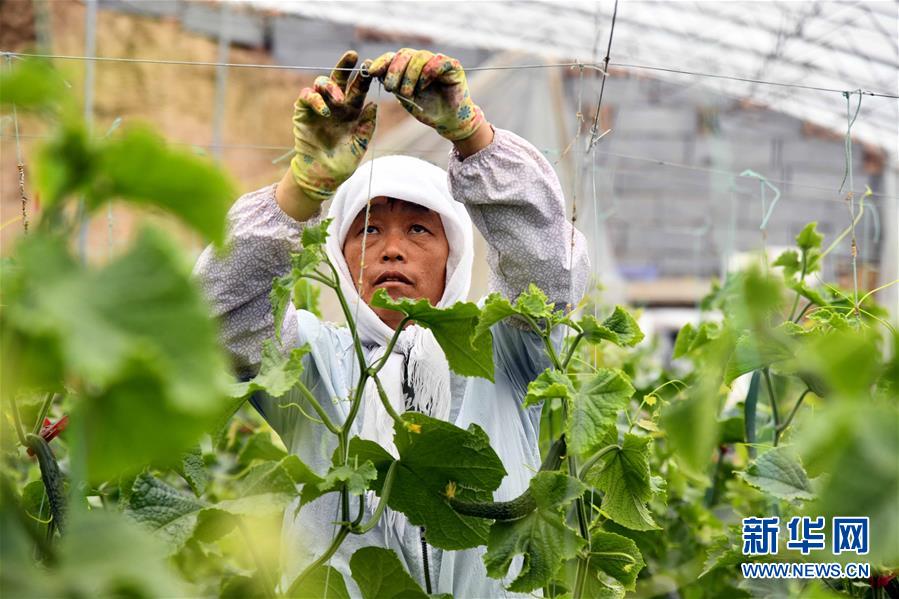 6月17日,在潍坊市寒亭区鲁夏幸福码头农场,村民在打理瓜秧。 1988年出生的夏俊磊原本从事信息化工程行业,2016年回到家乡山东省潍坊市寒亭区固堤街道,流转1000亩地,创办幸福码头农场,种植葡萄、有机蔬菜,养殖鸡鸭。幸福码头农场采用线上“互联网+农业”进行销售,线下在潍坊市区设立直营店,并推行会员制,不断拓展销售渠道。 夏俊磊的幸福码头农场不断壮大,通过成立农业种植专业合作社,农场面积如今已达8000余亩,吸纳周边村民1200余人,实现着增收致富梦。 新华社记者 郭绪雷 摄