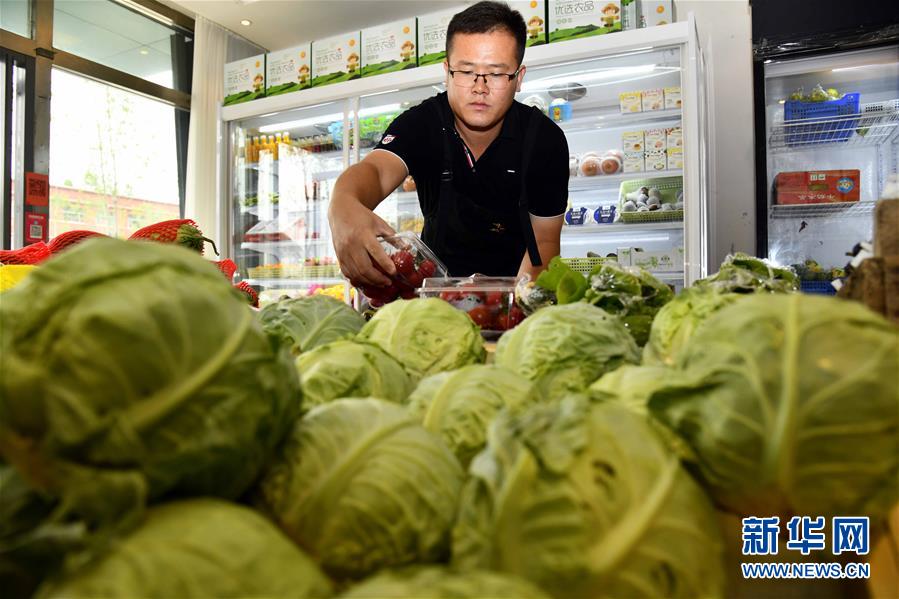 6月17日,在潍坊市寒亭区鲁夏幸福码头农场直营店,夏俊磊往货架上摆放有机西红柿。 1988年出生的夏俊磊原本从事信息化工程行业,2016年回到家乡山东省潍坊市寒亭区固堤街道,流转1000亩地,创办幸福码头农场,种植葡萄、有机蔬菜,养殖鸡鸭。幸福码头农场采用线上“互联网+农业”进行销售,线下在潍坊市区设立直营店,并推行会员制,不断拓展销售渠道。 夏俊磊的幸福码头农场不断壮大,通过成立农业种植专业合作社,农场面积如今已达8000余亩,吸纳周边村民1200余人,实现着增收致富梦。 新华社记者 郭绪雷 摄