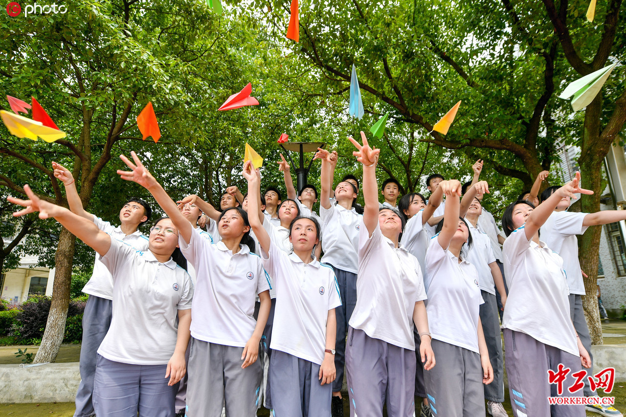2020年浙江省中考将于6月26日至27日举行,2020年6月17日,湖州市长兴县夹浦镇中学组织初三学生开展中医穴位按摩、户外趣味运动、放飞梦想飞机等快乐减压活动,帮助考生释放压力,以轻松乐观的心态迎接中考。谭云俸/IC photo