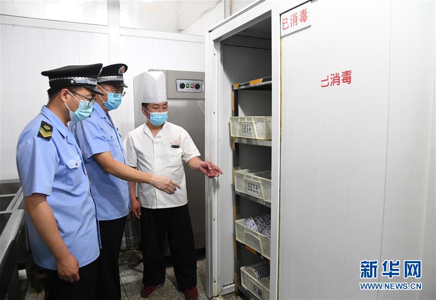 6月17日,在位于北京市海淀区的海碗居增光路店,执法人员对店内碗筷的消毒情况进行检查。新华社记者 任超 摄
