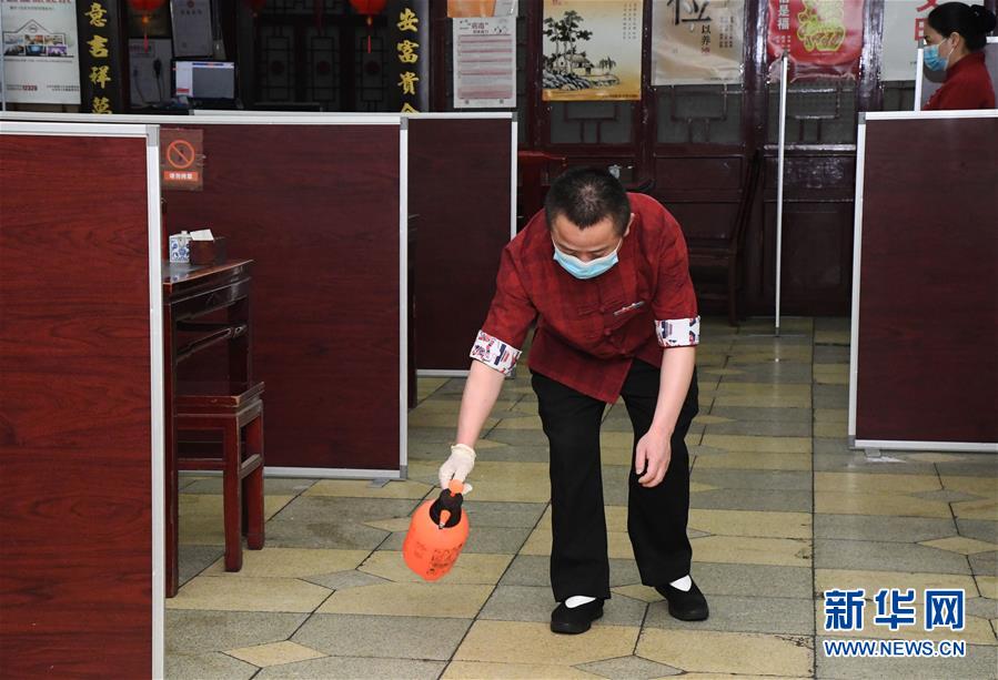 6月17日,在位于北京市海淀区的海碗居增光路店,工作人员对地面进行消毒。新华社记者 任超 摄