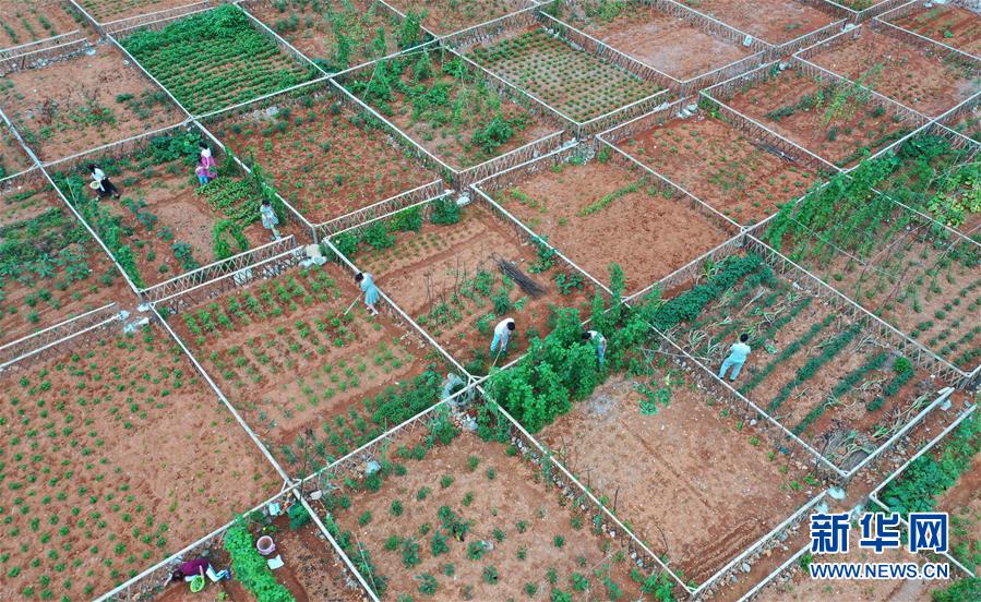 6月17日,易地扶贫搬迁群众在松桃苗族自治县育才易地扶贫搬迁集中安置点“微田园”里劳作(无人机照片)。新华社记者 杨楹 摄
