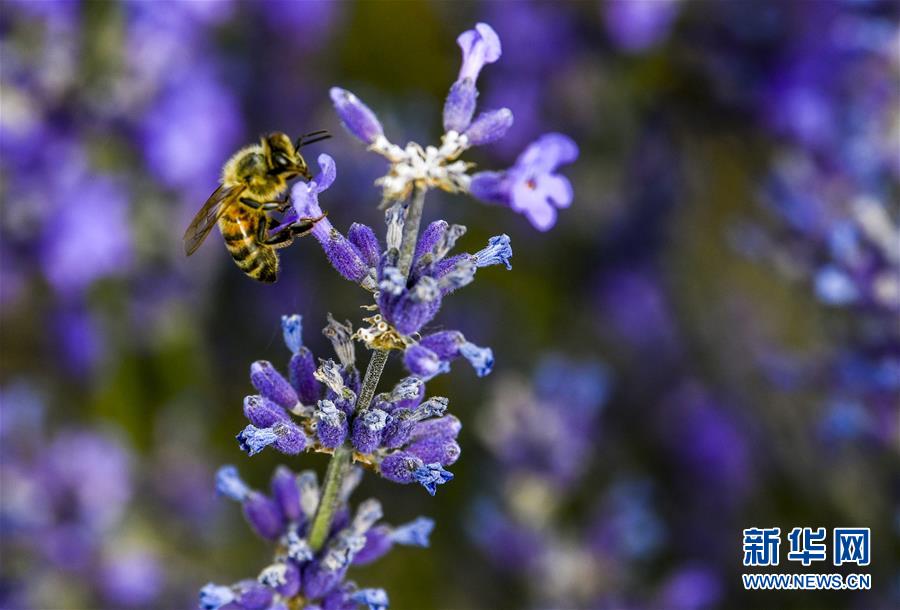 蜜蜂在霍城县芦草沟镇四宫村的一处薰衣草花田里采蜜(6月16日摄)。新华社记者 赵戈 摄
