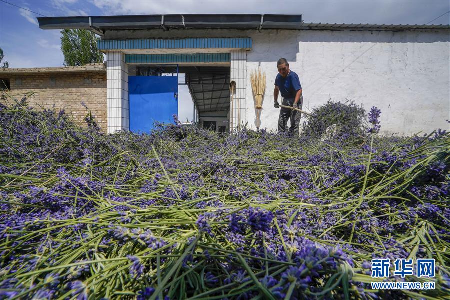 霍城县芦草沟镇四宫村的村民马英国在家门口晾晒薰衣草干花(6月16日摄)。新华社记者 赵戈 摄