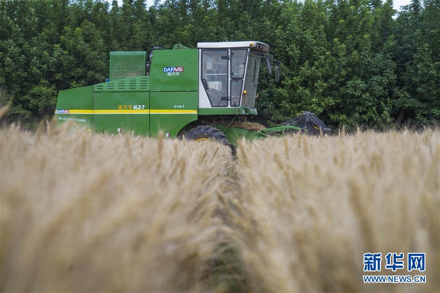 6月17日,河北唐山遵化市东新庄镇西庄村的农民驾驶农机收割小麦。新华社发(刘满仓 摄)